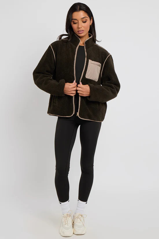 Khaki fleece jacket, zip front zip chest pocket super cosy vibes, side pockets