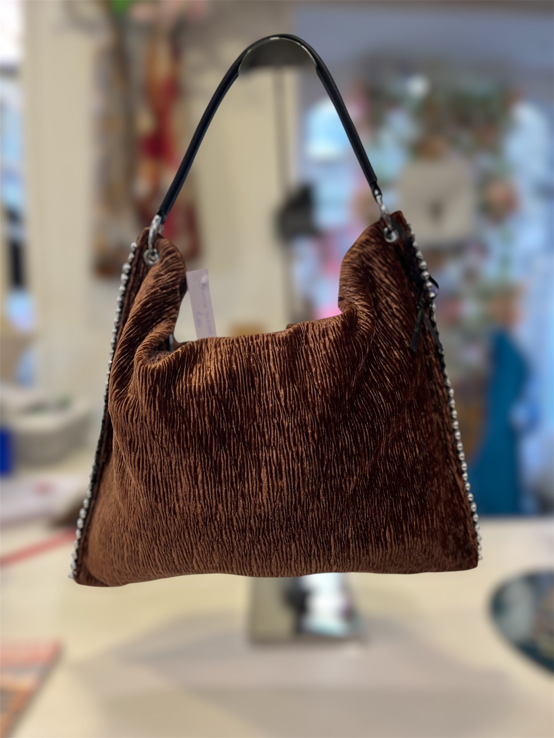 Velvet shoulder bag, long adjustable strap inside, studded detail down sides. Zip opening into main compartment