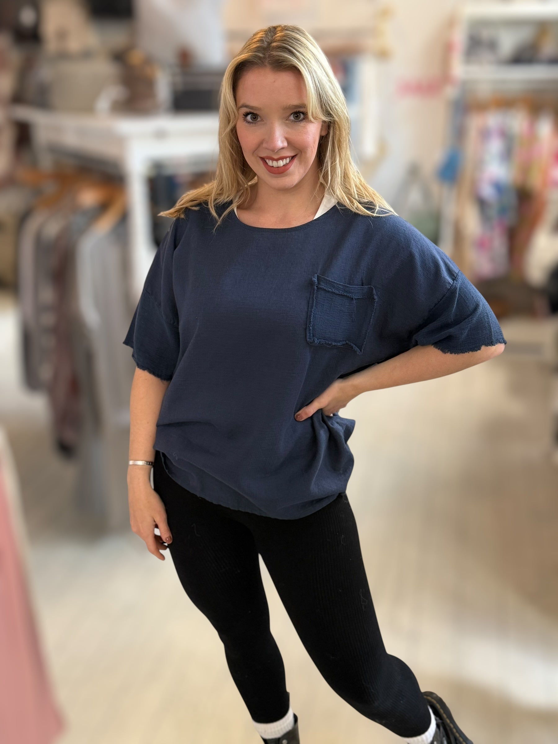 Plain tee with one pocket with jaggered edge look to pocket & sleeves