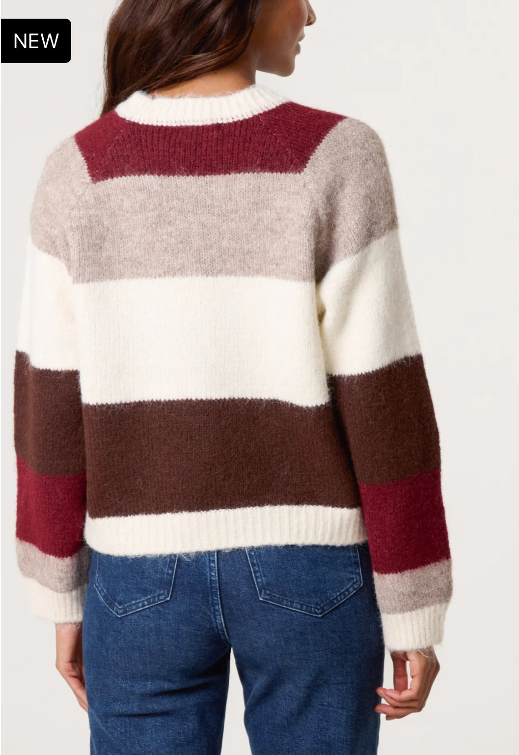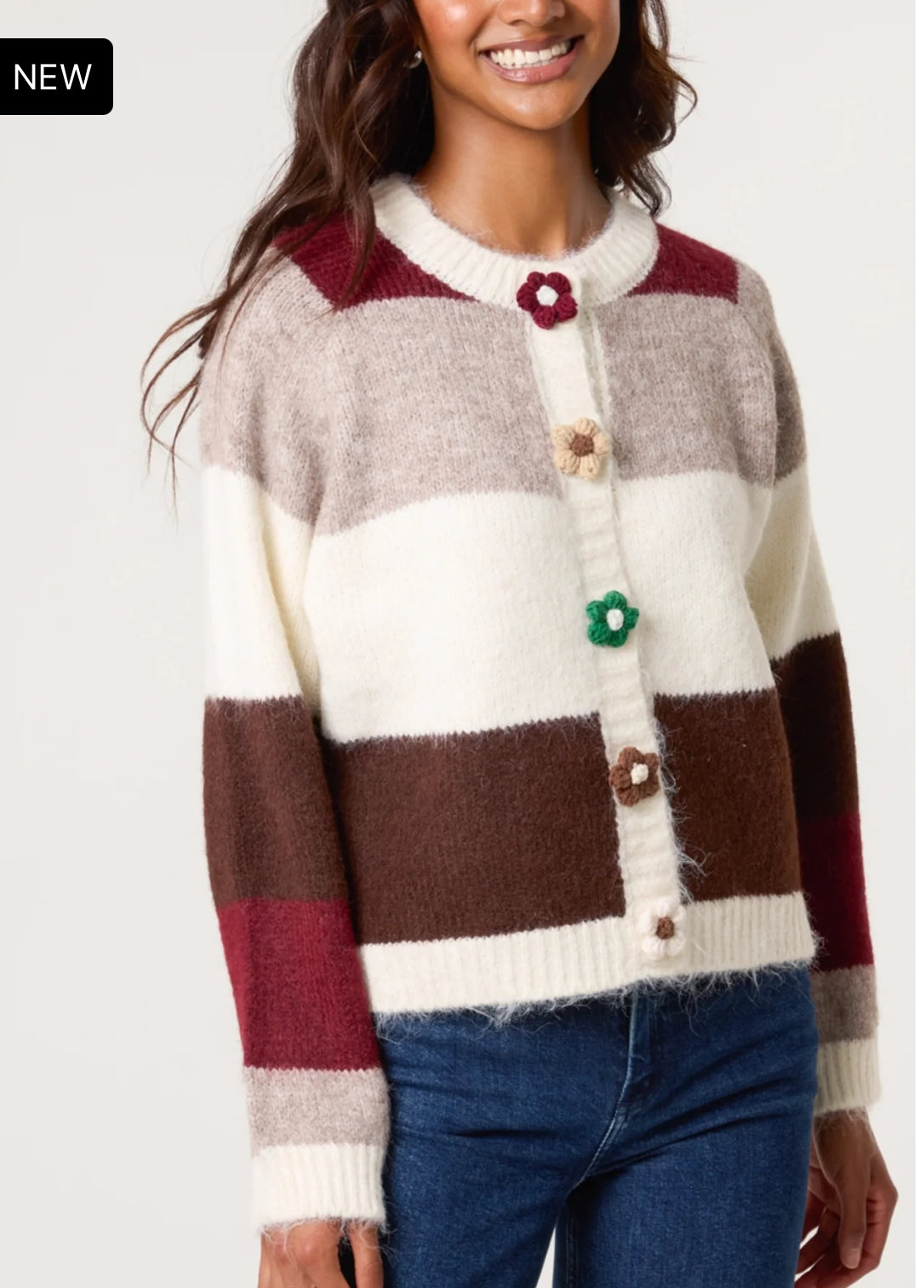 Beautiful large bandage stripe knit Cardi with knitted flower popper button detail. Size small to medium and medium to large. Model in photograph wears small/ medium.