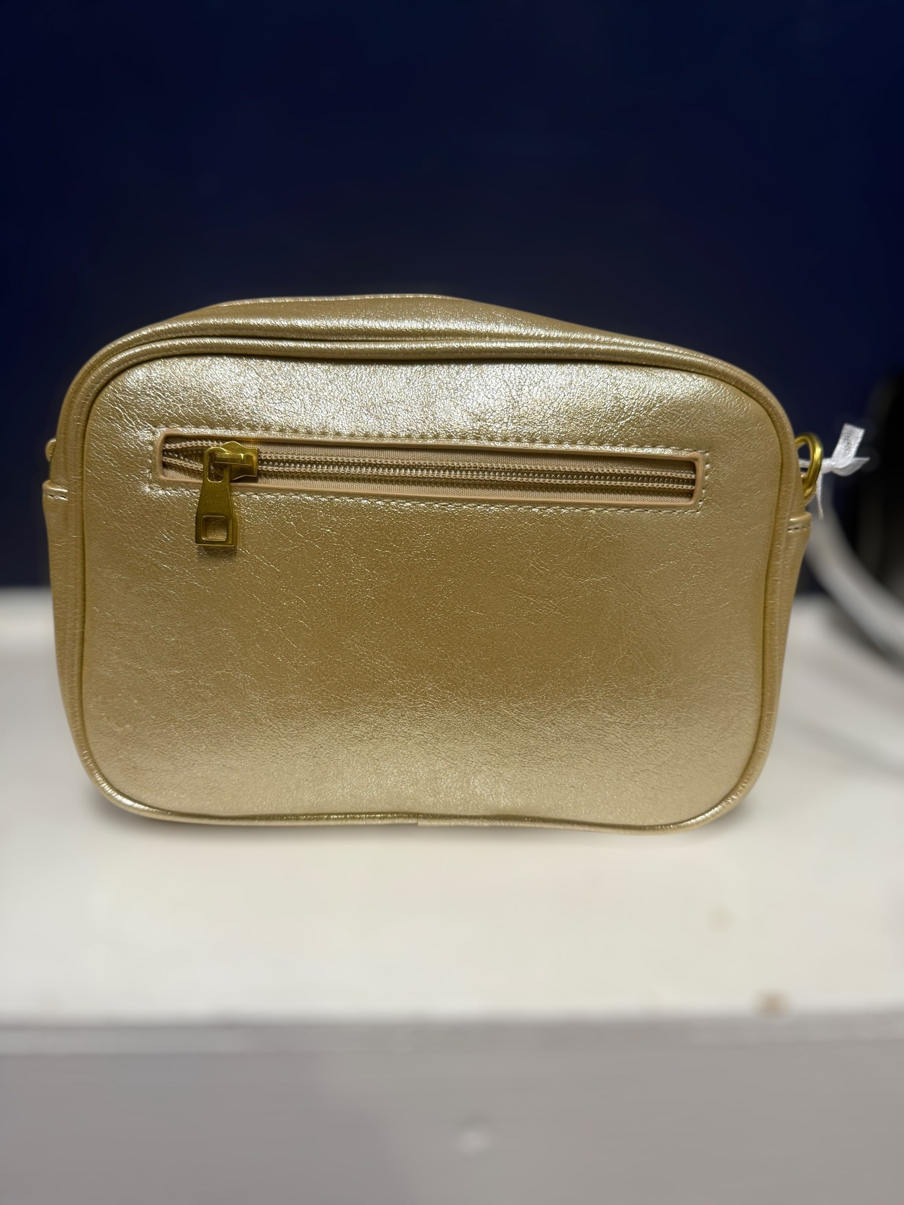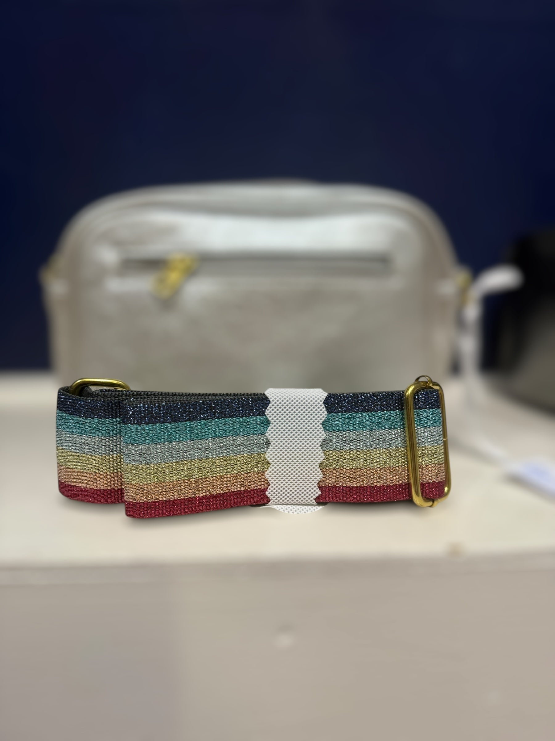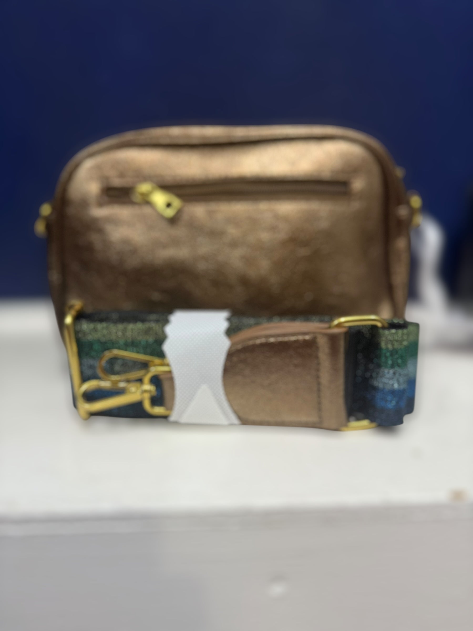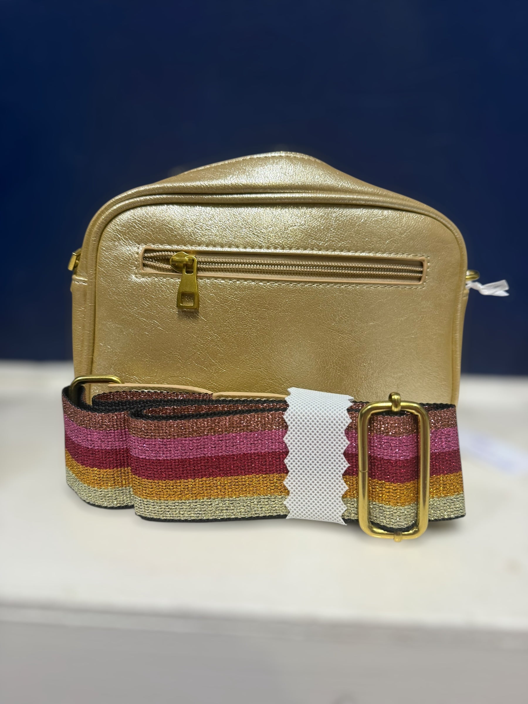 Beautiful metallic effect handbag with zip fastening removable strap that can be changed with the interchangeable straps - zip to main compartment and zip at the back pocket. Comes with a striped metallic strap