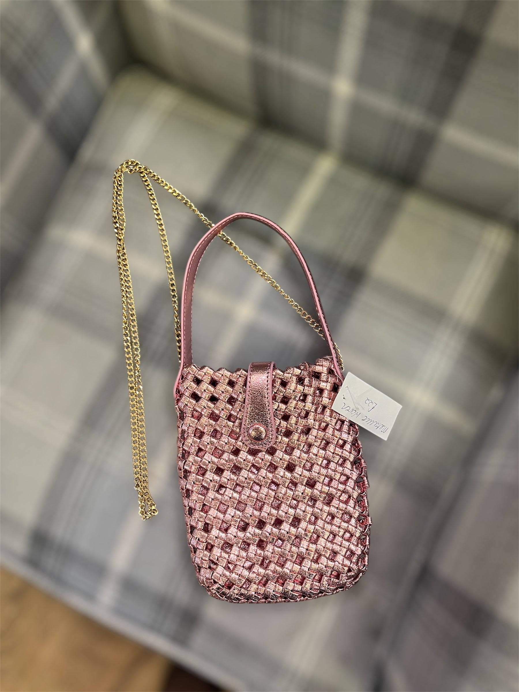Cute little metallic crossbody bag, has handle or long gold strap that can be removed.