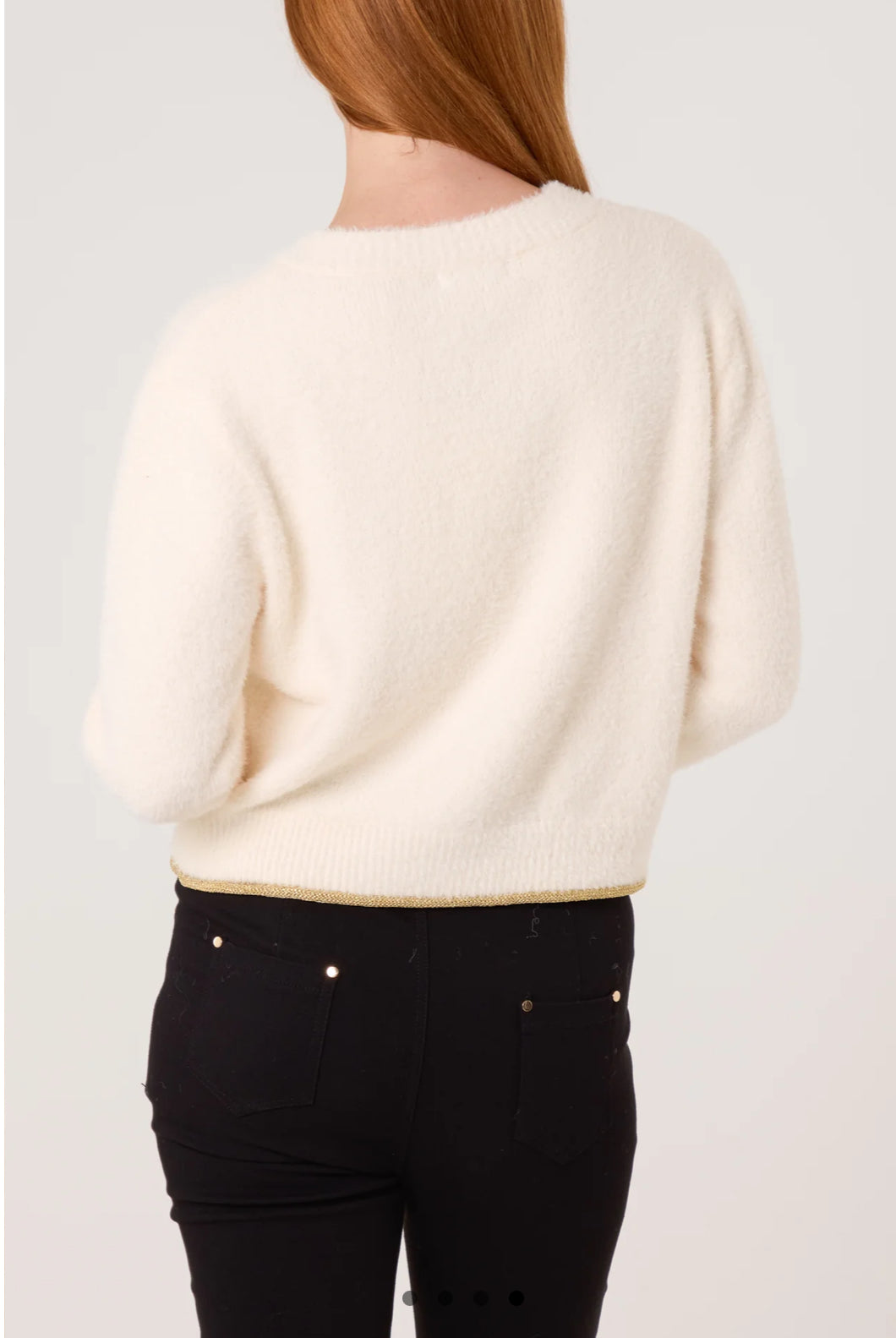 Soft Fluffy ivory cream cardigan with gold rose detailed buttons and metallic trim