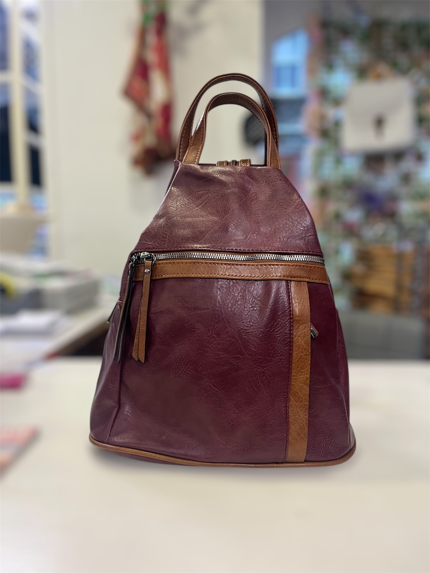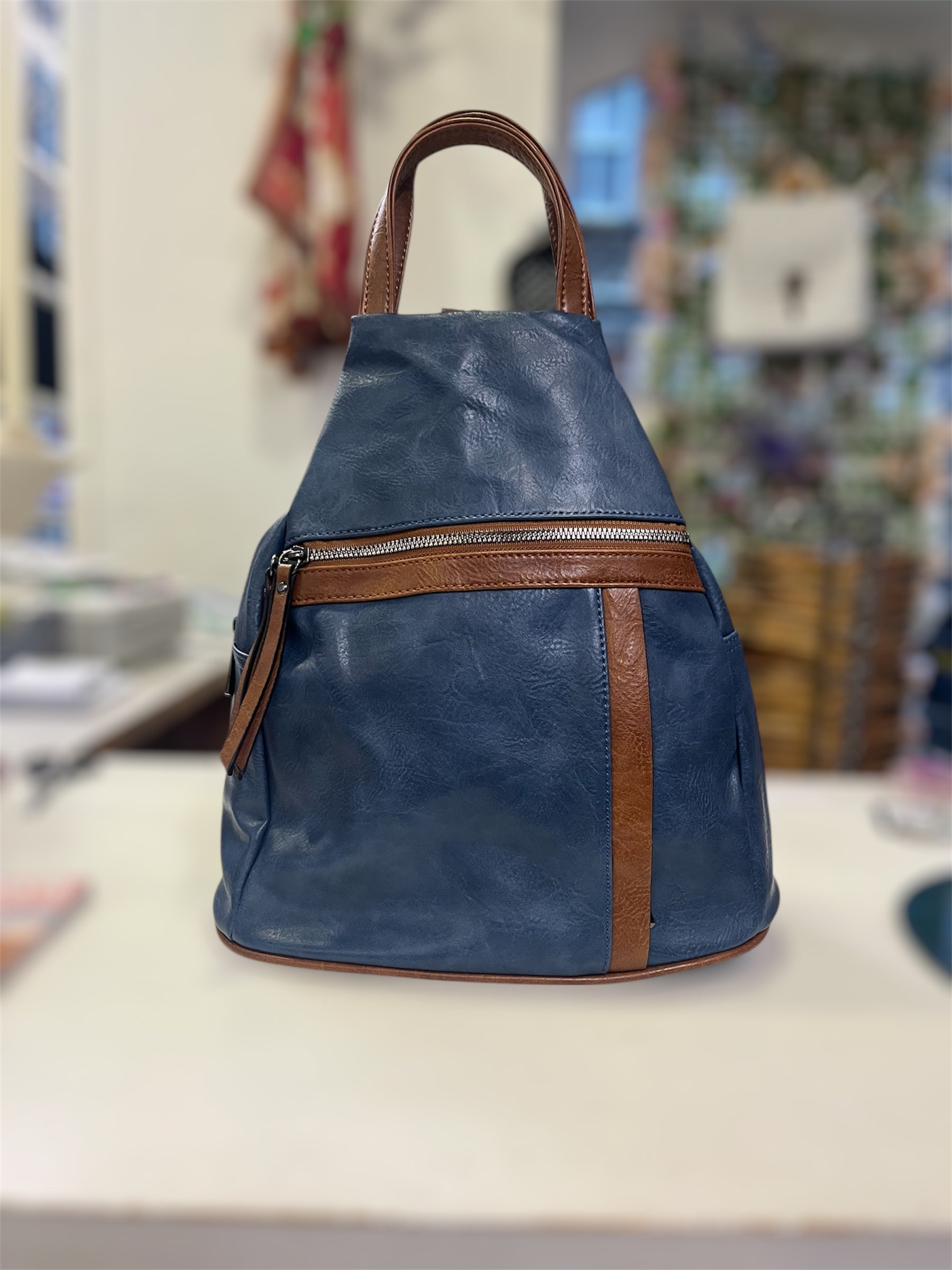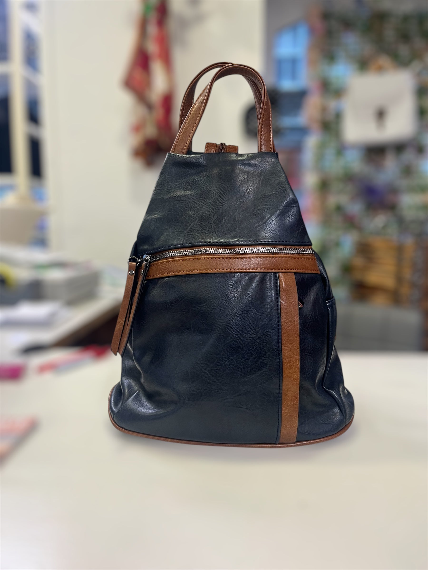 Contrast rucksack, with front zip pocket little hidden front zip pocket. Carry handle, straps zip up and down to use and ruck or carry on shoulder as one. Main zipped compartment