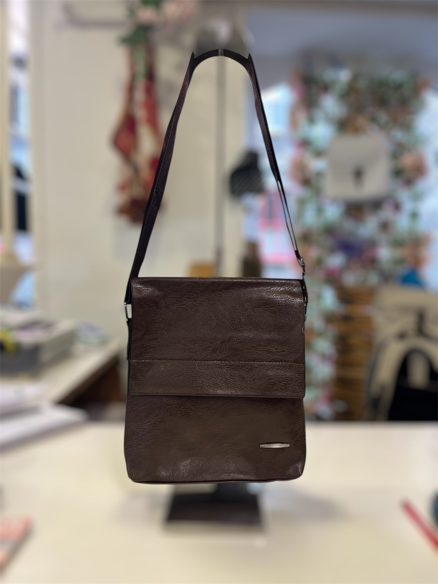 Plain satchel, adjustable crossbody strap, flap opening into zipped compartment. Zipped pocket to rear
