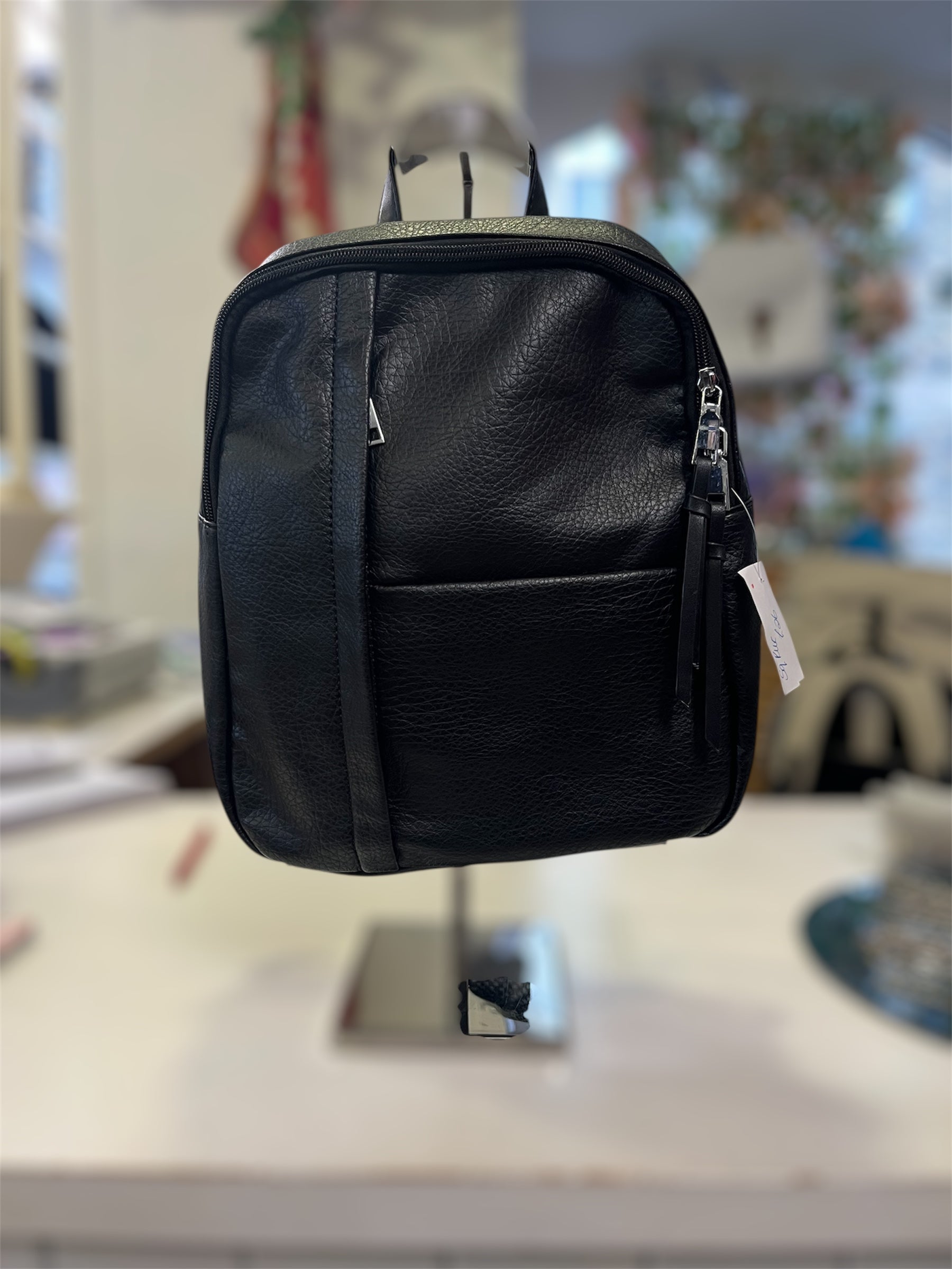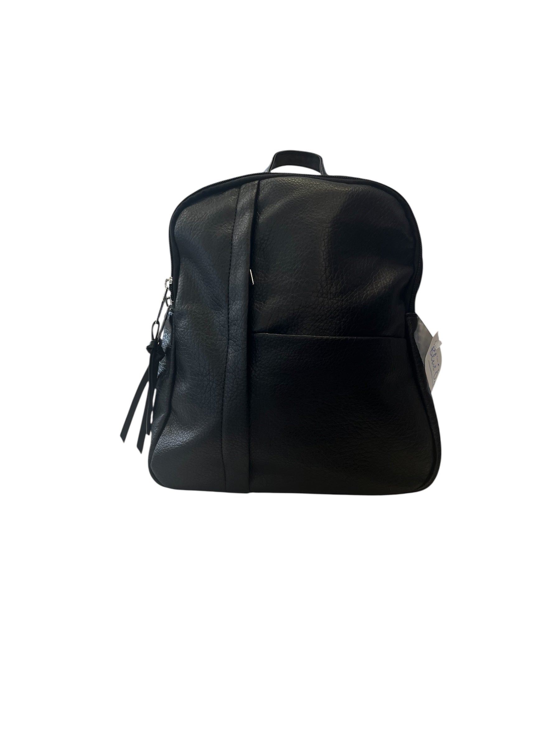 Black rucksack with adjustable straps, rear zip pocket main zip compartment with front size zip pocket
